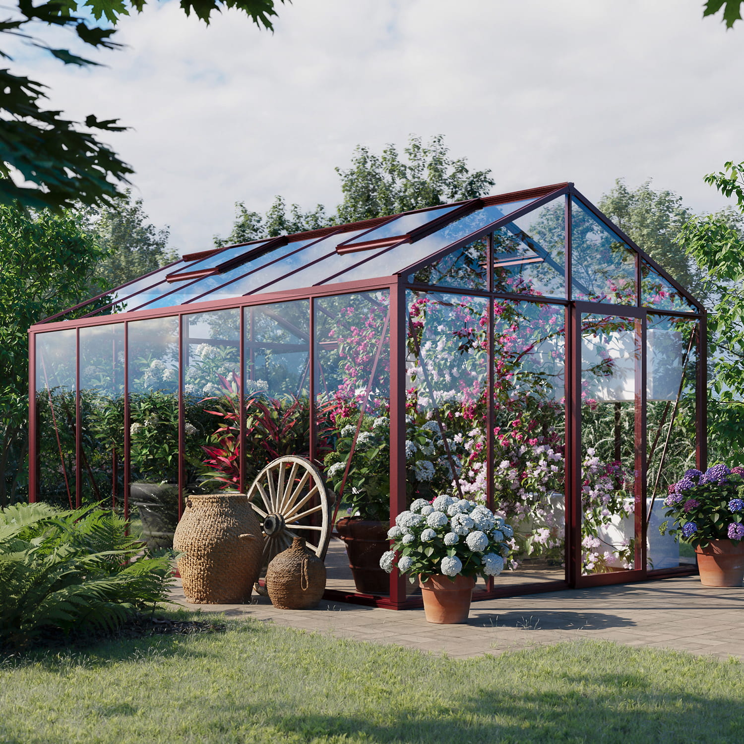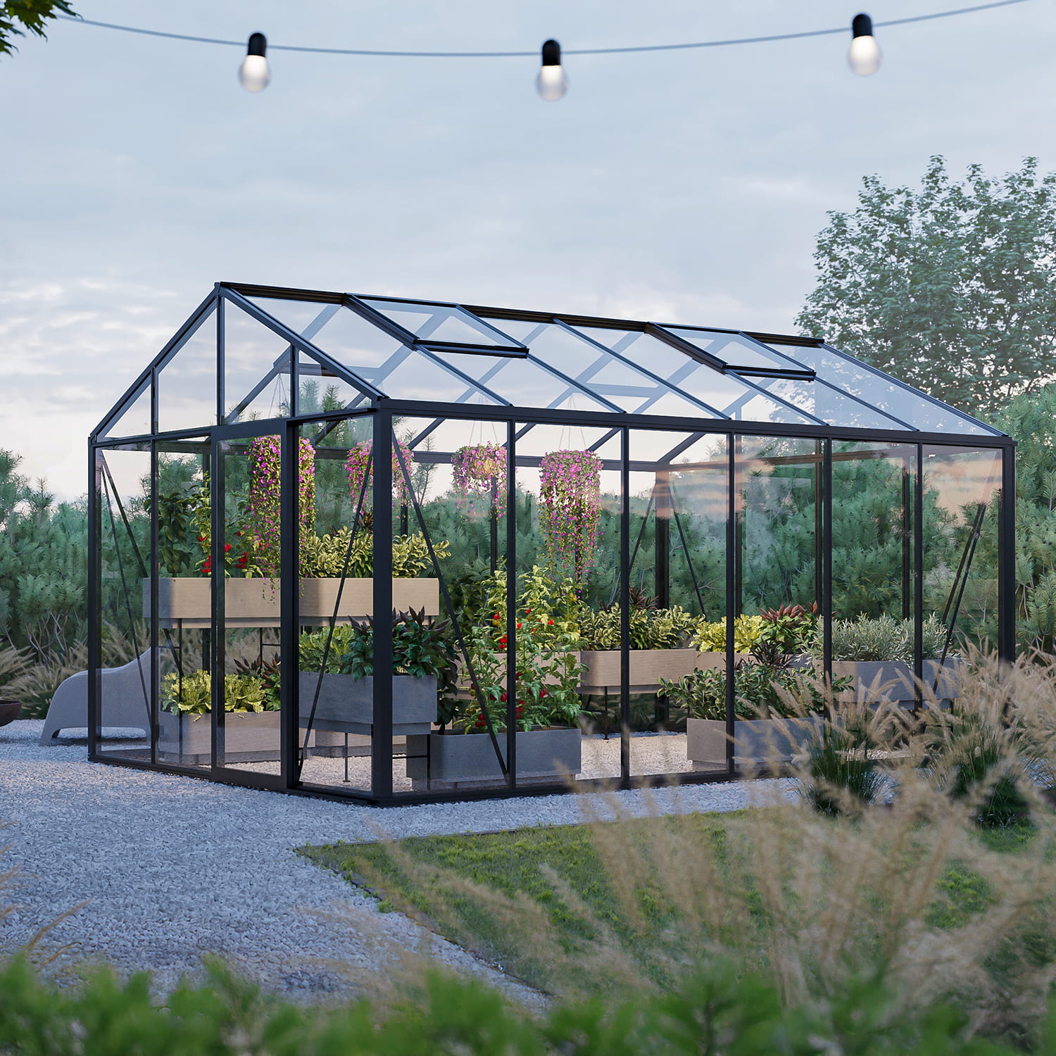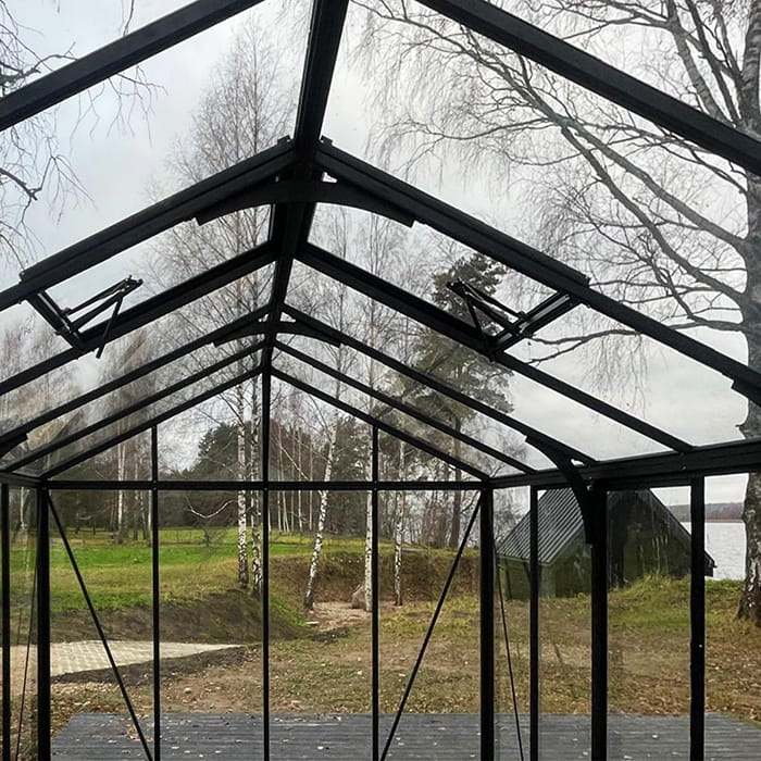 Elegancka, duża szklarnia ogrodowa Klasyk o powierzchni 14,22 m². Dostępna z bezpiecznym szkłem hartowanym o grubości aż 4 mm, co przekłada się na wyjątkową wytrzymałość i bezpieczeństwo. Drzwi przesuwne oraz cztery okno dachowe zapewniają odpowiednią wentylację.